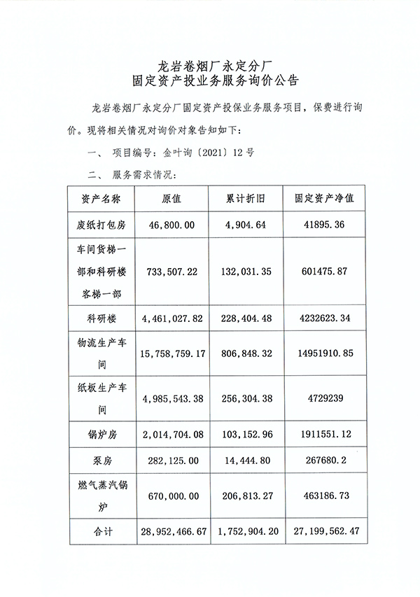 龍巖卷煙廠永定分廠固定資產投保業務服務項目詢價公告