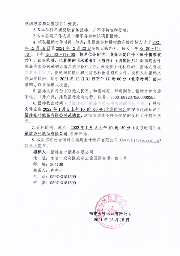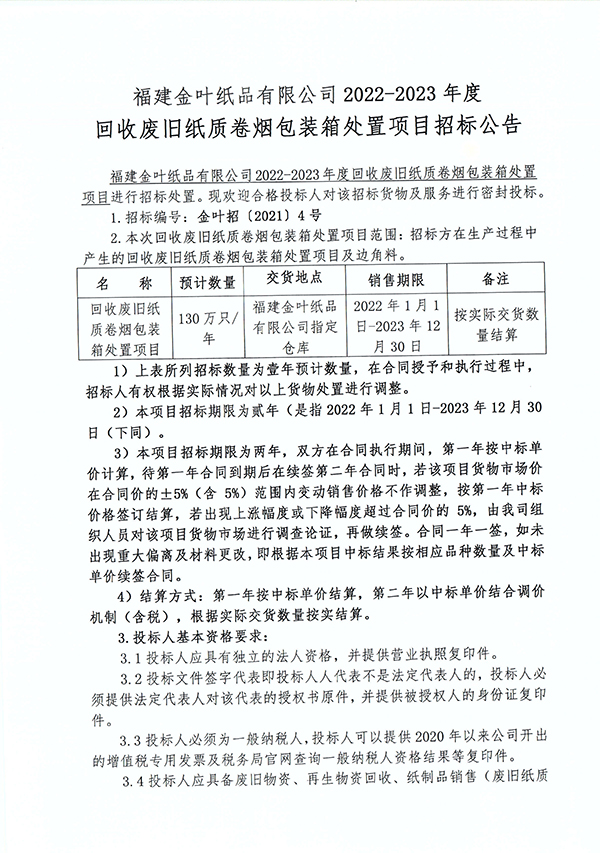 福建金葉紙品有限公司2022-2023年度回收廢舊紙質卷煙包裝箱處置項目招標公告