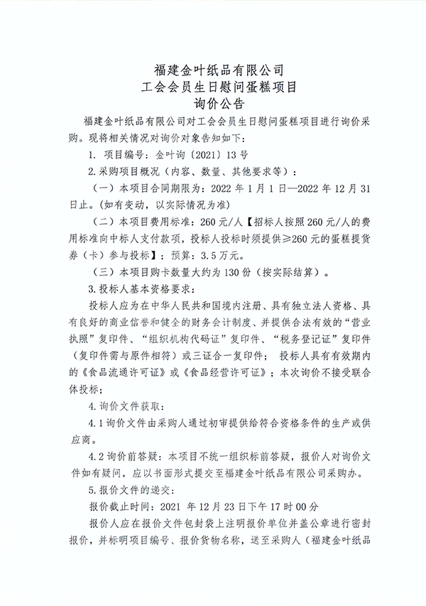 福建金葉紙品有限公司工會(huì)會(huì)員生日慰問蛋糕項(xiàng)目詢價(jià)公告