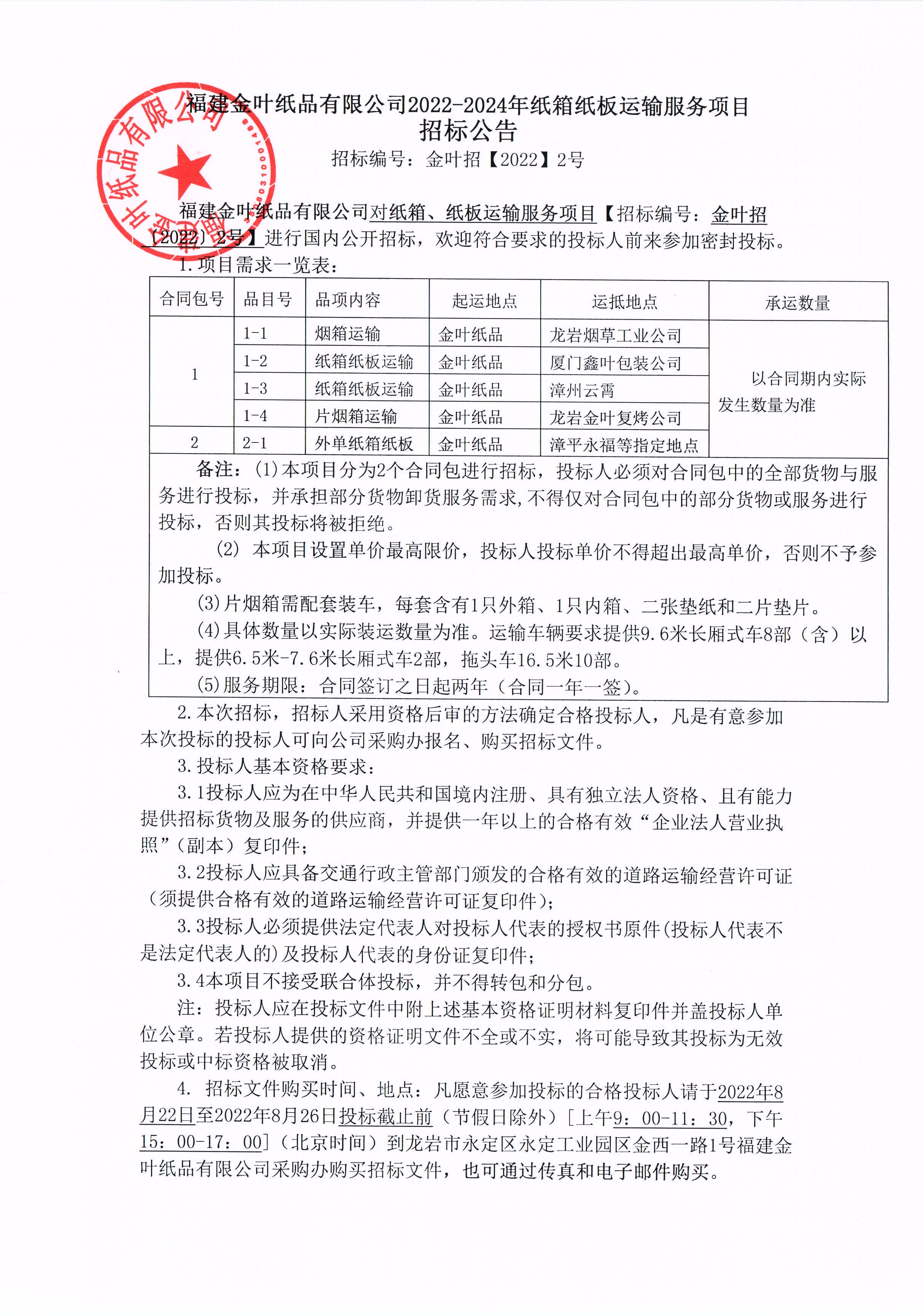 福建金葉紙品有限公司2022-2024年紙箱紙板運(yùn)輸服務(wù)項(xiàng)目招標(biāo)公告