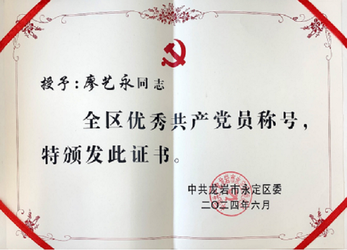 在慶祝中國(guó)共產(chǎn)黨成立103周年之際,為選樹(shù)典型、表彰先進(jìn)、弘揚(yáng)正氣,動(dòng)員和激勵(lì)廣大黨員和各級(jí)黨組織不忘初心、牢記使命,見(jiàn)賢思齊、踔厲奮發(fā),永定區(qū)委表彰了一批全區(qū)優(yōu)秀共產(chǎn)黨員、優(yōu)秀黨務(wù)工作者和先進(jìn)基層黨組織。我廠黨員廖藝永同志榮獲“全區(qū)優(yōu)秀共產(chǎn)黨員”稱號(hào)。